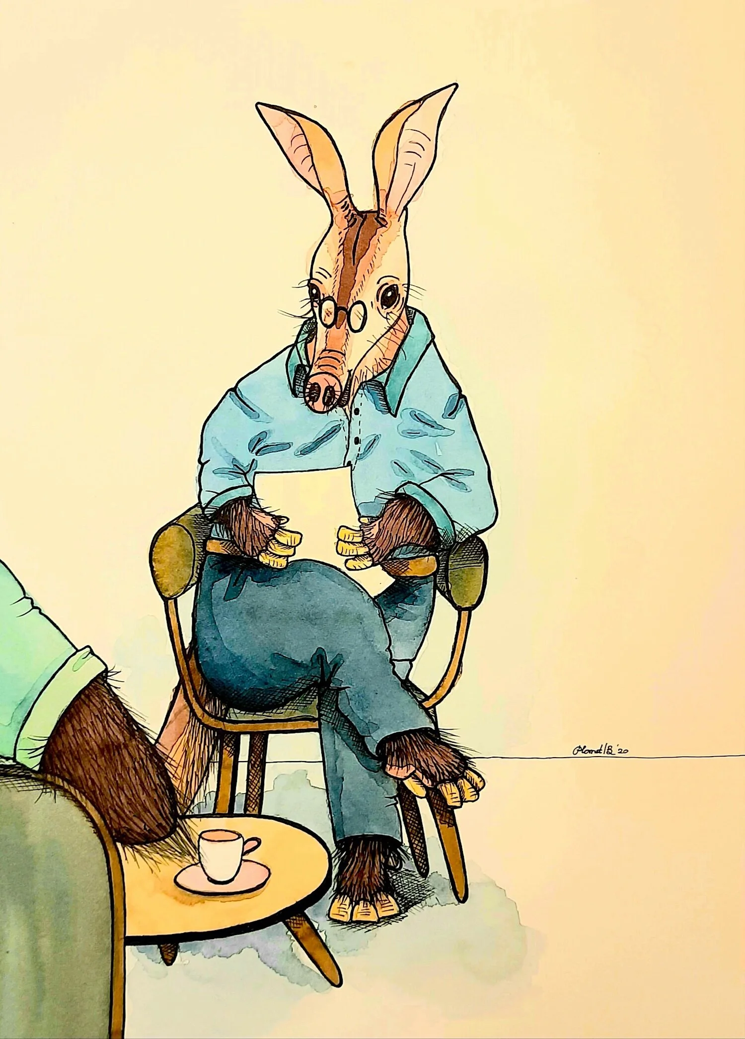 Aardvarken als therapeut. Opdracht voor een therapeutenpraktijk - Illustratie met inkt en aquarelverf.